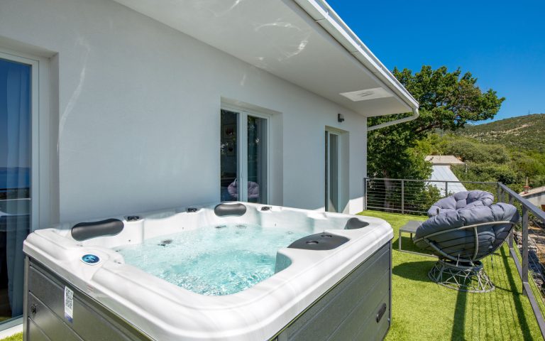 An oasis of peace with a swimming pool and sea view from hot tub